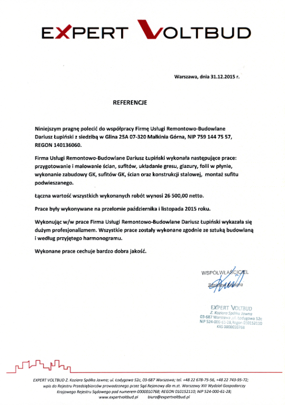 Reprezentuję firmę F.H.U Dariusz Łupiński, założoną w 2009 r. Specjalizujemy się w remontach mieszkań, domów, łazienek, pomieszczeń usługowych, kompleksowych wykończeniach wnętrz oraz w adaptacji pomieszczeń. Oferujemy fachową pomoc w doborze materiałów i funkcjonalnych rozwiązań oraz wysoką jakość wykonywanych usług. Prace remontowe wykonujemy na podstawie fachowych projektów i nietypowych zleceń czy pomysłów własnych klienta.